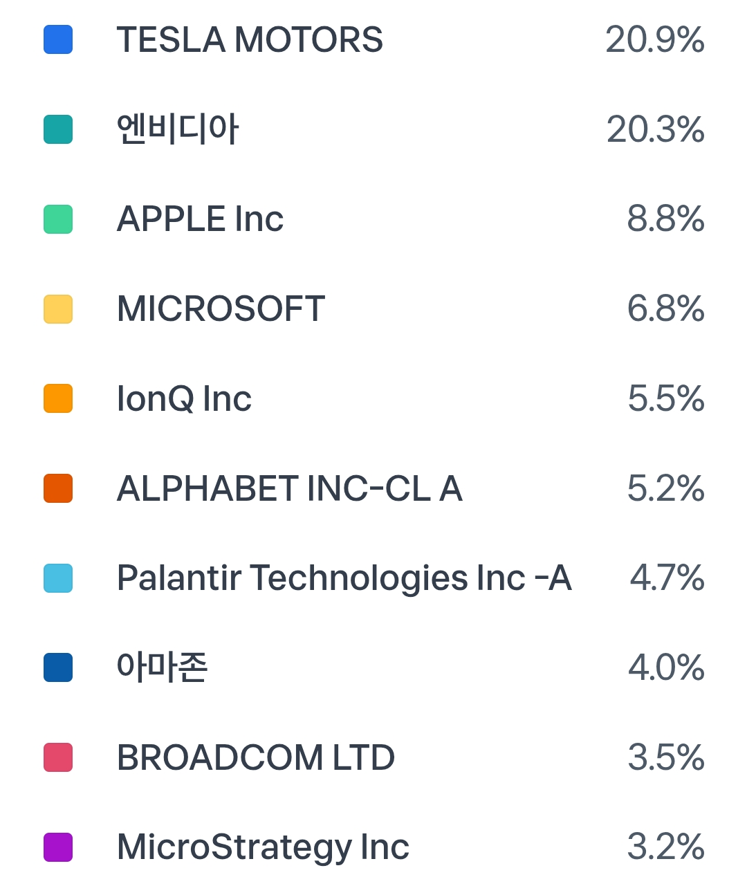 한국 사람들이 좋아하는 것으로 유명한 애플, 엔비디아, 테슬라 뿐 아니라 최근 한국 커뮤에서 유명했던 아이온큐나 팔란티어까지 포함되어있다. 집단지성의 힘을 보여주는 부분이다.