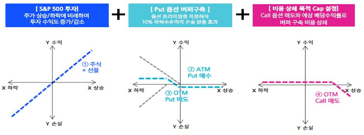 - 버퍼(Buffer): 지수가 일정 수준(약 10%) 하락하는 경우 투자자의 손실을 완충해주는 범위다. 예를 들어 S&P500이 9% 하락하면 투자자의 손실은 없고, 15% 하락하면 버퍼를 초과한 5%만 손실이 발생한다.